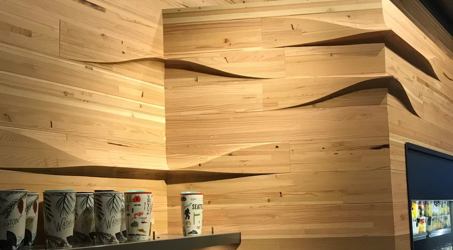 First as a tree, second as a structural beam, and now as an architectural panel. In addition to attaching directly to the wall and ceilings, D3 panels have become reception and bar fronts, benches, suspended ceiling panels, café clouds and shaped fins, room dividers, shelving, and more. D3 Panels are made from Douglas fir and Hemlock, reclaimed from solid and glue laminated beams and lumber. These are taken from deconstructed industrial, agricultural, and residential buildings in the Pacific Northwest. D3 Panels are available in two thicknesses; a 3/4” thick rigid panel and a more flexible 1/4” thick panel. The face is sanded smooth to the touch with straight edges for a butt joined installation.